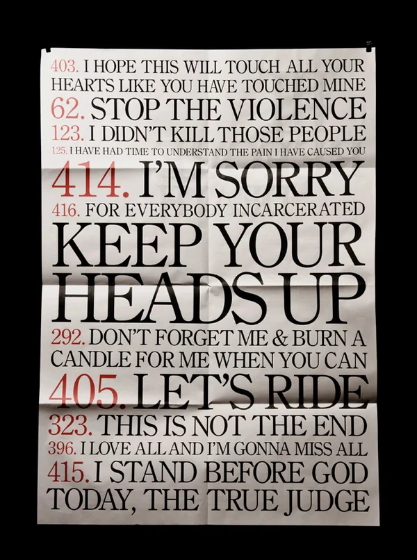 Posicionamiento en contra de la pena de muerte por inyección letal, practicada en Texas desde 1982. Tres minutos antes de ser ejecutados los presos tienen derecho a decir susúltimas palabras. Estas declaraciones son el eje emocional delproyecto. El trabajo busca mediante mediante la enfatización y el usode la tipografía, un acercamiento a la estética de los monumentos a los caídos y un lenguaje con connotaciones lapidarias.