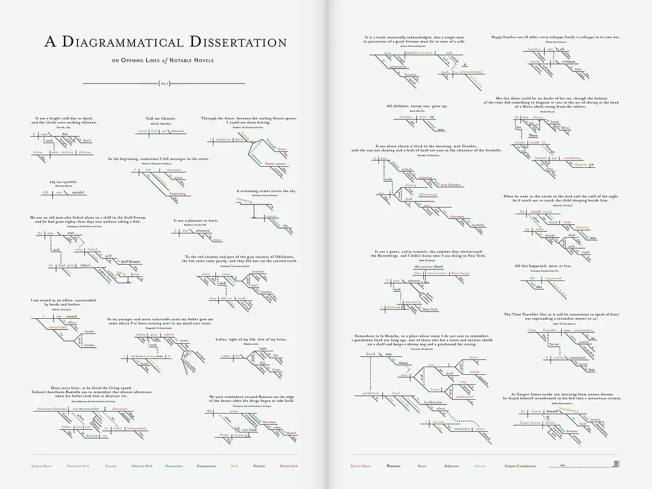 Maybe you spent a week in school making these, but the ones in your class almost definitely didn’t look as good. The folks at Pop Chart Lab, which now has an oeuvre of infographics depicting everything from classic games to beer, took a literary turn with their latest chart. A Diagrammatical Dissertation on Opening Lines of Notable Novels (itself one hell of a tongue-twister) is a series of simple Reed-Kellogg sentence diagrams, but there’s something special about placing them all next to each other. The start of Don Quixote looks especially circuitous next to the deceivingly simple “124 was spiteful” of Toni Morrison’s Beloved. Plus, “A screaming comes across the sky,” from Gravity’s Rainbow, is appropriately askew in this format. (More information here)