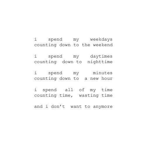 When I read this, I found myself agreeing to more than half of it. I need to keep repeating to myself to live in the moment. If I spend my time counting time, I will probably end up passing up my next big moment in life—I hope I do not miss it. June 5, 2013 Source: http://makemestfu.tumblr.com/post/52210985...